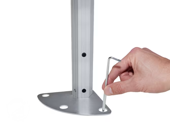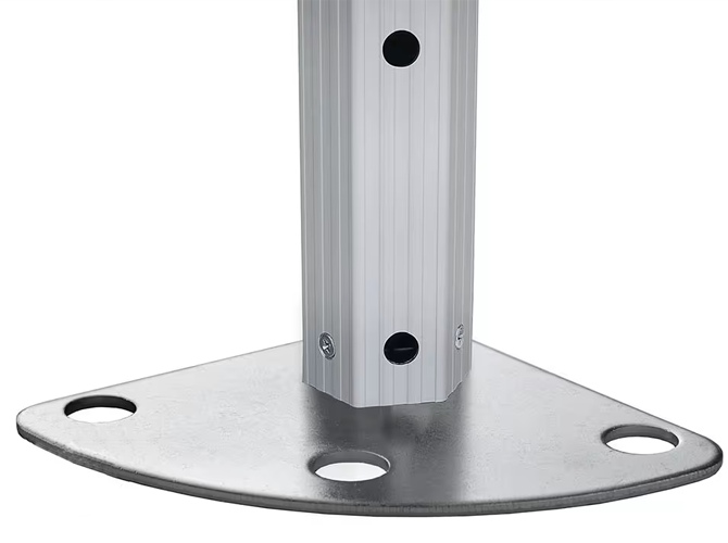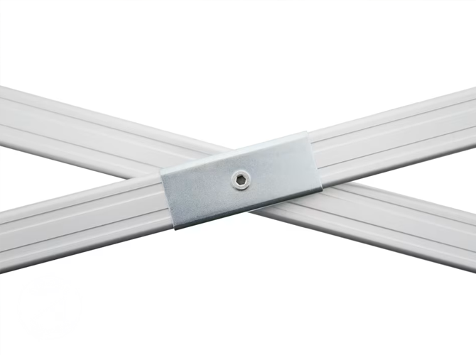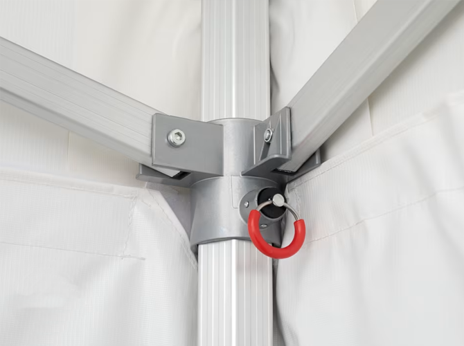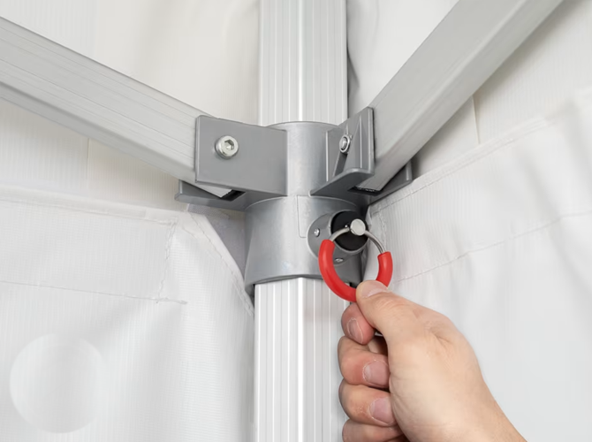 Už zmontovaný nožnicový mechanizmus umožňuje rýchle rozloženie – bez použitia náradia. Kombinácia vysokej stability a flexibility vďaka pevnému konektoru z kovu a zaisťovaciemu kolíku.